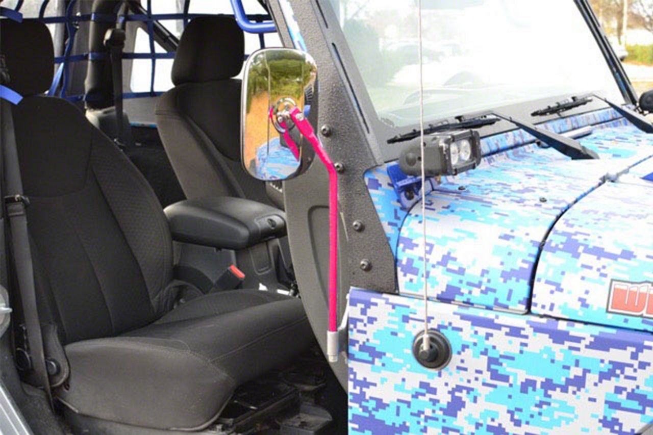 Quadratec adventure mirrors quickly fit into the door hinge pin holes when your doors are removed allowing you to get on the road or trail faster without having to fiddle. Door off mirrors for 1997 2017 jeep wrangler jk jku cj yj square doorless side mirrors quick release door hinge mirrors textured black 4 0 out of 5 stars 263 27 99 27. Jeep hinge mirrors include hardware. However it goes further than similar solutions by providing a bracing arm that fastens to a door hinge bolt.