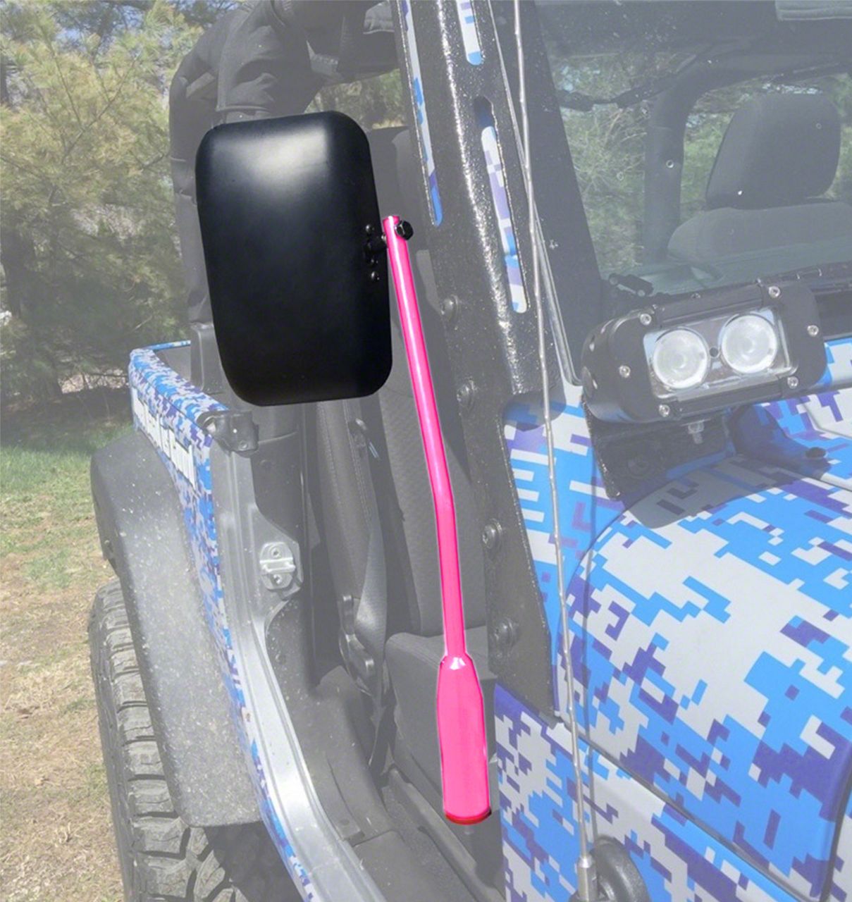 Once your jeep doors have been removed simply slip the mirror shanks into the door hinge pin holes and you are ready to take on the day.